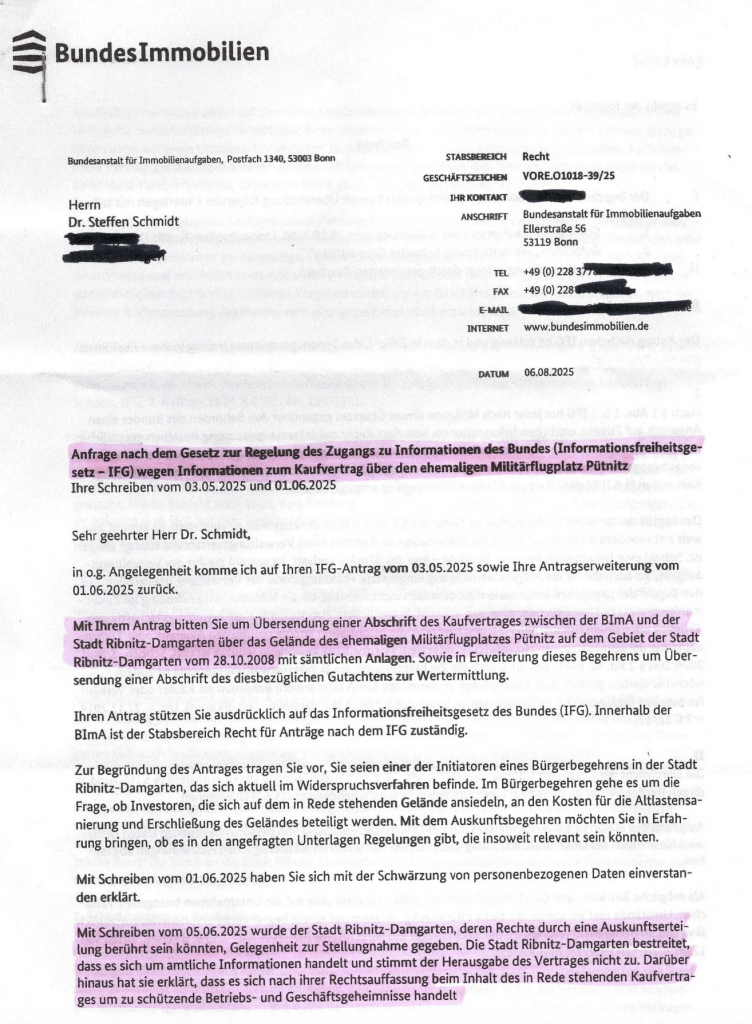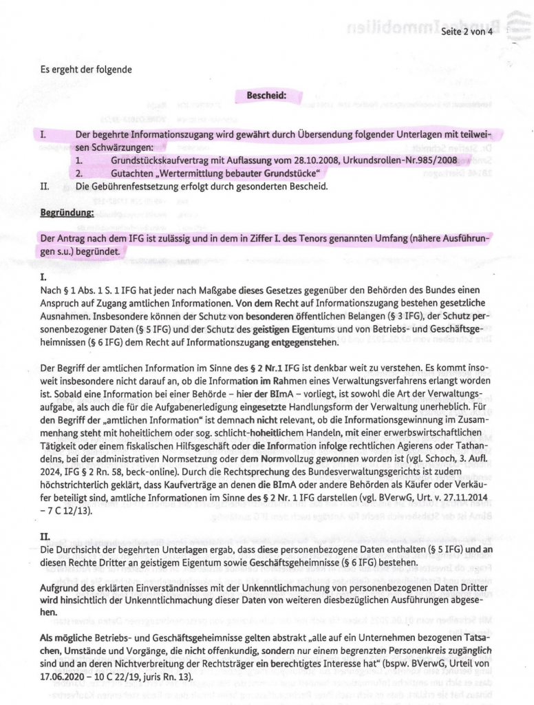 - 06.08.2025: Die BImA entscheidet: Der Kaufvertrag vom 28.10.2008 muss herausgegeben werden mit teilweisen Schwärzungen, wo es rechtlich nötig ist.